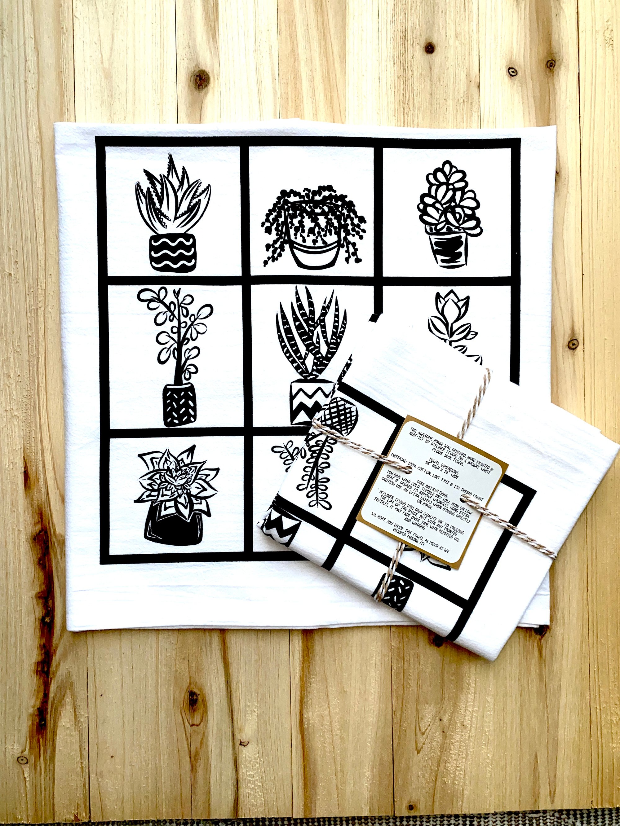The image is hand printed on a Deluxe Bright White flour sack towel by Cotton Creations. The towel is produced in their fair-trade partner facility in India and is the high standard for white, flat finish flour sack towels. Woven with 100% cotton and a 130 thread count, the towel also has a back corner hanging loop!